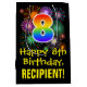 This fun, colourful, and exciting birthday-themed gift bag design features a large number "8" with a rainbow spectrum gradient style pattern, along with the message "Happy 8th Birthday,", and an editable recipient name. It also has a colourful background pattern inspired by the look of bursting celebratory fireworks. A gift bag like this might be a fun way of wrapping a birthday present or gift being given to somebody who is celebrating their 8th birthday. [~Z0000509]