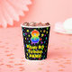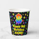 This joyful and exciting birthday-themed paper cup design features a large number “8” having a rainbow spectrum gradient inspired pattern. It also features the message “Happy 8th Birthday,”, and a customisable name. The background features a colourful star field inspired pattern. Colourful, vibrant paper cups like this might be fun to have at a birthday celebration/party being held in celebration of somebody’s 8th birthday. [~Z0000540]