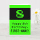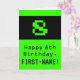 The front of this fun and nerdy birthday-themed greeting card design features a large green classic video game style number "8". It also features the birthday greeting message "Happy 8th Birthday,", and a personalised name. The inside features a personalised birthday greeting message, or could perhaps be cleared and left blank if a message is to be written by hand instead. A geeky birthday card like this might be a fun way to send birthday wishes to somebody who is celebrating their eighth birthday. [~Z0000430]