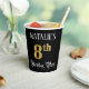 This fancy and ornate birthday-themed paper cup design features an editable name and the message “8th Birthday Party”. The large number “8th” has an imitation/faux gold-inspired colouring pattern, and the words “Birthday Party” are in luxurious script-style text. The background is coloured black by default (although it can be customised). Opulent, elegant paper cups like this might be useful to have at a birthday party being held to honour somebody’s eighth birthday. [~Z0000567]