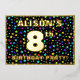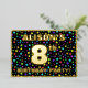 The front of this vibrant eighth birthday party/celebration foil invitation card design features a personalised name, a large number “8th”, the message “BIRTHDAY PARTY!”, and a border. The background of the front features an exciting, colourful pattern of star shapes. The back features personalised details about the event, such as the date, time, place, and any other relevant information. Customised invitations like these might be a fun way to invite attendees to a birthday party/gathering being held in celebration of somebody’s 8th birthday. [~Z0000600]