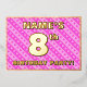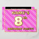 The front of this upbeat and loving eighth birthday party/celebration foil invitation card design features an editable name, a large number “8th”, the message “BIRTHDAY PARTY!”, and a border. The background of the front has a joyful dark pink and light pink stripes pattern, with heart shapes. The back features personalised details about the event, such as the date, time, venue/location, and any other information that may be useful. Personalised invitations like these might be a fun way to invite attendees/guests to a birthday gathering/party being held to honour somebody’s 8th birthday. [~Z0000603]