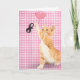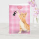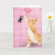 Gold tabby cat with pink heart balloon for 8th birthday on pink and white gingham background.