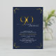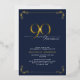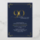 This beautiful invitation features hand lettered calligraphy artfully presenting 'ninety' in luxurious hand lettering against a blue background, adorned with delicate swirls in the corners top and bottom in real gold foil, along with the name and the number 90. This image will have all your guests excitedly anticipating your fabulous ninetieth festivities!