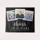 This custom 90th birthday tapestry features a collage of three custom square photos above the phrase "Cheers to 90 years" in elegant white calligraphy script and sans serif font on a black background. Add the guest of honour's name and birthday below. A great way to celebrate someone who's turning ninety!
