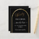 A Save the Date card for a 90th birthday party. A black background, decorated with a faux gold arch. Personalise and add a date and your name. The text: Ninety and Save the Date is written with a large trendy hand lettered style script.