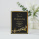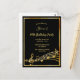 A trendy, modern 90th birthday party invitation card for both men and women. A classic black background, with faux gold frame and music notes, golden coloured letters. Templates for your party information. Back: white background.