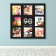 A unique 90th birthday gift or keepsake, celebrating her life with a collage of 8 of your photos. Add images of her family, friends, pets, hobbies or dream travel destination. Personalise and add a name, age 90 and a date. Grey and white coloured letters. A chic black background. This canvas is also available in our store with white or rose gold coloured background.