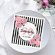 A napkin for a 90th birthday party. Classic slim black and white vertical stripes as background. With girly and feminine pink flowers, roses and peonies as decoration.