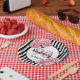 A paper plate for a 90th birthday party. Classic slim black and white vertical stripes as background. With girly and feminine pink flowers, roses and peonies as decoration.