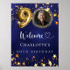A welcome posters for a 90th birthday party. A navy blue background with elegant faux gold stars. The blue colour is uneven. Personalise and add a photo, name and text. White letters.