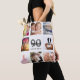 A unique gift for a woman's 90th birthday, celebrating her life with a collage of 8 of your own photos, pictures. Personalise and add her name, age 90 and a date. A chic white background. Grey and black letters and numbers. The name is written with a modern hand lettered style script.