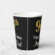 This elegant, luxurious, and sophisticated birthday-themed paper cup design features a large ordinal number “90th” having an imitation/faux gold-inspired gradient pattern, plus the birthday greeting message “Happy 90th Birthday,” and a custom name in a script-style font. It also has a black-coloured background. Elegant birthday themed paper cups like this might be used at a party celebrating somebody’s 90th birthday. [~Z0000538]