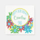 Celebrate the 90 year old's Birthday with Colourful illustrated Flowers Paper Napkins. Her Personalised Name to be printed in Script Typography and the Age and Happy Birthday in Unique Teal Text.