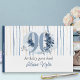 90th birthday party guest book with number 90 decorated with rose buds, flower blooms and foliage in shades of coastal blue and sand. Subtle feminine and elegant design with watercolor floral arrangements, paint splatters and brush strokes. Perfect for 90th birthday celebration with coastal vibe, beach house or lakeside or water front venue for example.