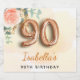 For an elegant and feminine 90th birthday birthday party. A golden watercolored background. Decorated with a rose gold and blush pink watercolored rose flower, floral, green eucalyptus leaves, sprigs, greenery and faux gold sprigs. Personalise and a name. Black and golden letters. The name is written with a modern hand lettered style script. Number 90 is written with a golden balloon style font.