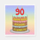 This upbeat and cheerful birthday paper napkin design features a cartoon-style depiction of a three-tier birthday cake having numeral-shaped candles on top showing the number “90“, along with the message “HAPPY 90TH BIRTHDAY,”, and a customisable recipient name. The background features a multi-colour pastel rainbow spectrum inspired gradient pattern. Fun birthday themed paper napkins like these might be used at a birthday party in celebration of somebody’s 90th birthday. [~Z0000623]