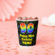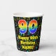 This fun and joyful music-themed birthday paper cup design features a large number “90” having a rainbow spectrum gradient inspired pattern. It also features the message “Happy 90th Birthday,”, and a customisable name. The background features a multicolored music notes and symbols pattern. Vibrant, colourful paper cups like this might be fun to have at a birthday celebration/party being held to celebrate somebody’s 90th birthday. [~Z0000541]