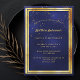 A trendy, modern 90th birthday party invitation card for men, guys, male. A dark blue, navy blue background. The blue color is uneven. With a faux gold frame and golden confetti sprinkle, golden colored letters. Templates for your party information.