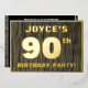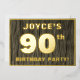 The front of this bold ninetieth birthday celebration/party foil invitation card features a custom name, a large number “90th”, the message “BIRTHDAY PARTY!”, and a border, all in foil. There is a rustic, yet elegant, faux wood grain appearance inspired pattern for the background of the front. The back features personalised details about the event, such as the date, time, location/venue, and any other relevant information. Customisable invitations like these might be used to invite attendees/guests to a birthday gathering being held to honour somebody’s 90th birthday. [~Z0000598]