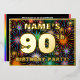 The front of this bold ninetieth birthday party/celebration foil invitation card design features a customisable name, a large number “90th”, the message “BIRTHDAY PARTY!”, and a border. The background of the front has an upbeat, colourful bursting celebratory fireworks-inspired pattern. The back features personalised details about the event, such as the date, time, venue/place, and any other relevant information. Customisable invitations like these might be a fun way to invite attendees/guests to a birthday gathering/party being held to honour somebody’s 90th birthday. [~Z0000602]