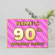 The front of this joyful and upbeat ninetieth birthday celebration/party foil invitation card design features a custom name, a large number “90th”, the message “BIRTHDAY PARTY!”, and a border. The background of the front features a loving light pink and dark pink striped pattern, with heart shapes. The back features personalised details about the event, such as the date, time, venue/location, and any other useful information. Customised invitations like these might be a fun way to invite guests to a birthday gathering being held to honour somebody’s 90th birthday. [~Z0000603]