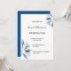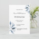 An elegant and simple 90th birthday party invite. On front a chic white background decorated with blue botanical branches, florals. Templates for a name, age 90 and your party details.