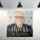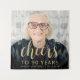 This custom 90th birthday tapestry features the guest of honour's personalised photo, name, and birthday, along with the word "Cheers" in elegant gold calligraphy script. A dark screen helps make the text pop. A great way to celebrate someone who's turning ninety!