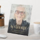 This custom 90th birthday party welcome sign features the guest of honour's personalised photo, name, and birthday, along with the word "welcome" in elegant gold-coloured calligraphy script. A dark screen helps make the text pop. A great way to celebrate someone who's turning ninety!