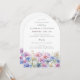 Elegant watercolor asters create a floral border at the bottom of this arch-shaped birthday invitation. The soft pastel purple, pink blue and white flowers are the September birthday month flower making this the perfect theme for your September birthday.