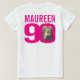 Happy 90th Birthday pink text, custom front, and back photo, and name t-shirt. Fun 90th personalised photo hot pink and white birthday tee design. Personalise this birthday shirt with two photographs of the birthday girl in the middle of the number 0 on the front and back ideal for a past and present photo opportunity. Great idea for adding some fun to a milestone nintieth birthday party or event. Other matching items and colours are available. Exclusive design by Sarah Trett for www.mylittleeden.com