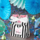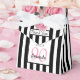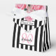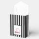 A favour box for a 90th birthday party. Classic black and white vertical stripes as background. With girly and feminine pink flowers, roses as decoration. With the text: Thank You!