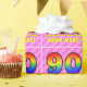 This upbeat and fun 90th birthday-themed wrapping paper design features a large number "90" having a colourful pattern inspired by the appearance of a rainbow spectrum. It also features the message "Happy 90th Birthday,", and a customisable name. The background features a light pink and dark pink stripes pattern containing loving pink heart shapes. Fun wrapping paper like this might be used when wrapping presents being given to somebody in celebration of their 90th birthday. [~Z0000415]