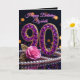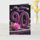 Celebrate a magnificent milestone with this luxurious 90th Birthday card, designed to make her feel like the gem she is. The front design features the number "90" elaborately crafted in faux purple amethyst gemstones and gold encasing, accompanied by a soft pink rose with gold filigree leaves and a classic strand of pearls. Set against a deep black background with glowing bokeh lights, this design exudes elegance and glamour.