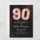 90th birthday party invitation. Elegant design in faux glitter rose gold and black. Invite card features rose gold number 90 balloons and script font. Perfect for a stylish bday celebration. Message me if you need custom age.