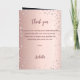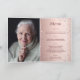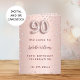 A faux rose gold gradient background with pink diamonds. The name is written with a modern dark rose gold coloured hand lettered style script. Number 90 is written with a balloon style font, script. Welcome text, photo, menu and a thank you note on the back.