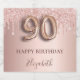 Elegant, classic, glamourous and girly for a 90th birthday party. Rose gold and blush pink, gradient background. Decorated with rose gold, pink faux glitter drips, paint dripping look. Personalise and add a name. With the text: Happy Birthday. The text is written with a modern dark rose coloured hand lettered style script. Number 90 is written with a balloon style font.