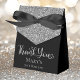 This fabulous modern 90th Birthday Silver Glitter Black Thank You favour box with sparkling silver glitter, Thank You in a trendy script font and the birthday girl's name in silver with an elegant black bow would be perfect for your event. It would be great for a candy station, on a thank you gift table, or at each place setting with a favour. Be sure you order enough for all your guests.