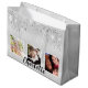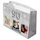 A gift bag for a girly and glamourous 90th birthday. A silver metallic looking background with glitter dust. Personalise and add 3 photos and a name. Number 90 is written with a balloon style font. Perfect as a party favour bag or as a gift bag.