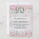 A modern, stylish and glamourous invitation for a 90th birthday party. A faux silver looking background, decorated with pink and faux silver glitter dust. Personalise and add your name nad party details. Number 90 is written with a balloon style font, script.
