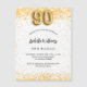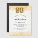 For an elegant 90th birthday party. A chic white background. Decorated with faux gold glitter, sparkles. Personalise and add a name, age and party details. The name is written with a hand lettered style script. Number 90 with balloon style font.