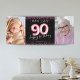 Milestone girly ninetieth birthday party banner featuring a trendy black background, 2 large photos, pink sparkle glitter, 90 pink hellium balloons, and a custom celebration template that is easy to personalise.