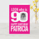 Fun 90th hot pink and white personalised photo girls milestone birthday card. Personalise this birthday card with a photograph of the birthday girl in the middle of the number 0. Great idea for adding some pink fun to a milestone ninetieth birthday. Other matching items and colours are available. Exclusive design by Sarah Trett for www.mylittleeden.com