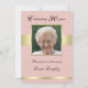 This 90th birthday invitation is very elegant. The design features her photo as the highlight with a golden frame on a rose gold background. Golden bands appear on both sides of the frame. In addition, a golden band appears along the bottom. On the reverse side you can put all of your invitation details on a golden background. Copyright henishouseofpaper