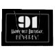 This 1920s/1930s look inspired vintage appearance birthday gift bag design features a large art deco style inspired number "91", the message "Happy 91st Birthday,", an editable name, and a border pattern consisting of thin lines. It features a black-coloured background. A gift bag like this may be used when wrapping a birthday present or gift being given to somebody who is celebrating their 91st birthday. [~Z0000495]