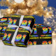 This cheerful, colourful, and fun birthday themed wrapping paper design features a large number "91" and the message "HAPPY BIRTHDAY,", both having a rainbow spectrum gradient inspired pattern colouring, along with a bold yellow editable recipient name. The background is coloured black. Fun wrapping paper like this might be used when giving a gift or present in honour of somebody’s 91st birthday. [~Z0000475]