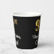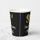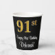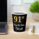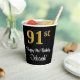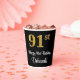 This sophisticated, elegant, and luxurious birthday-themed paper cup design features a large ordinal number “91st” having an imitation/faux gold-like gradient pattern, along with the birthday greeting message “Happy 91st Birthday,” and a personalised name in a script-style font. The background is coloured black. Paper cups like this might be used when celebrating somebody’s 91st birthday. [~Z0000538]