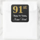 This stylish, luxurious, and sophisticated birthday square sticker design features a large ordinal number “91st” having a faux/imitation gold-like look, along with the birthday greeting message “Happy 91st Birthday,” and an editable name in a script-style font. It also has a black-colored background. Elegant birthday-themed stickers like this might be used when giving a gift or present in celebration of somebody’s ninety first birthday, or perhaps may be given out to the guests at a birthday party. [~Z0000517]