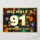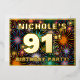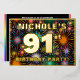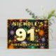 The front of this upbeat ninety-first birthday party foil invitation card design features an editable name, a large number “91st”, the message “BIRTHDAY PARTY!”, and a border. The background of the front features an exciting, colourful bursting celebratory fireworks-inspired pattern. The back features personalised details about the event, such as the date, time, place, and any other important information. Customisable invitations like these might be a fun way to invite attendees to a birthday gathering/party being held to celebrate somebody’s 91st birthday. [~Z0000602]