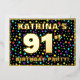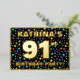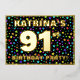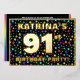 The front of this eye-catching and vibrant ninety-first birthday celebration/party foil invitation card design features a personalised name, a large number “91st”, the message “BIRTHDAY PARTY!”, and a border. The background of the front features an exciting, colourful star shapes pattern. The back features personalised details about the event, such as the date, time, location, and any other information that may be relevant. Customised invitations like these might be a fun way to invite attendees/guests to a birthday party being held to honour somebody’s 91st birthday. [~Z0000600]